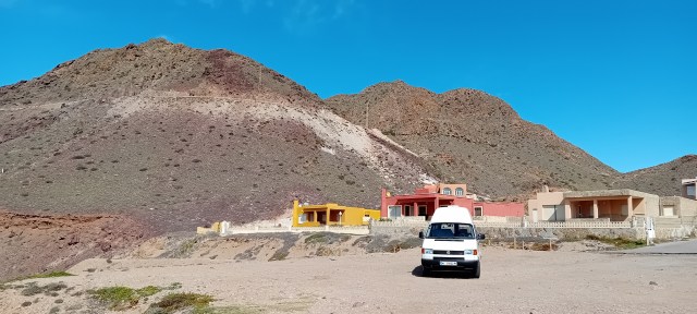 Headed west along the coast — narrow roads, cliffs dropping to the sea. The van overheats on long climbs. I carry water jugs now, just in case.